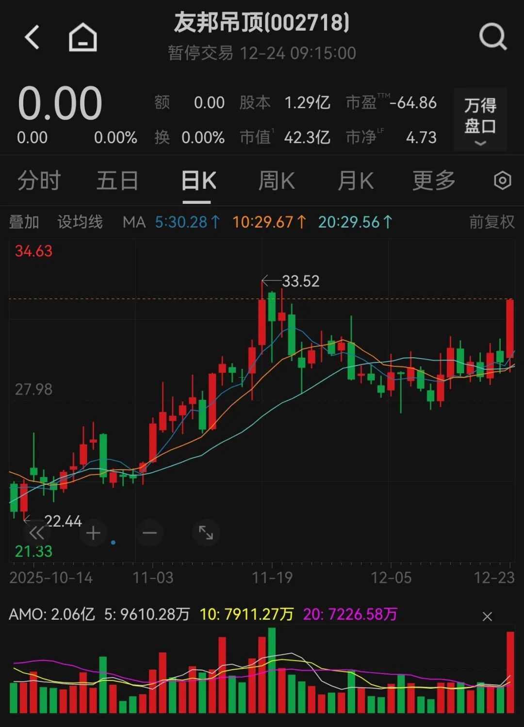 此外,友邦吊頂(002718)在12月24日早間發(fā)布公告稱,公司正在籌劃控制權(quán)變更相關(guān)事項,經(jīng)過公司申請,股票于12月24日起開始臨時停牌。在此之前,友邦吊頂?shù)墓蓛r在12月23日以漲停收盤,截至當日收盤,公司股價報32.67元/股,總市值為42.29億元。