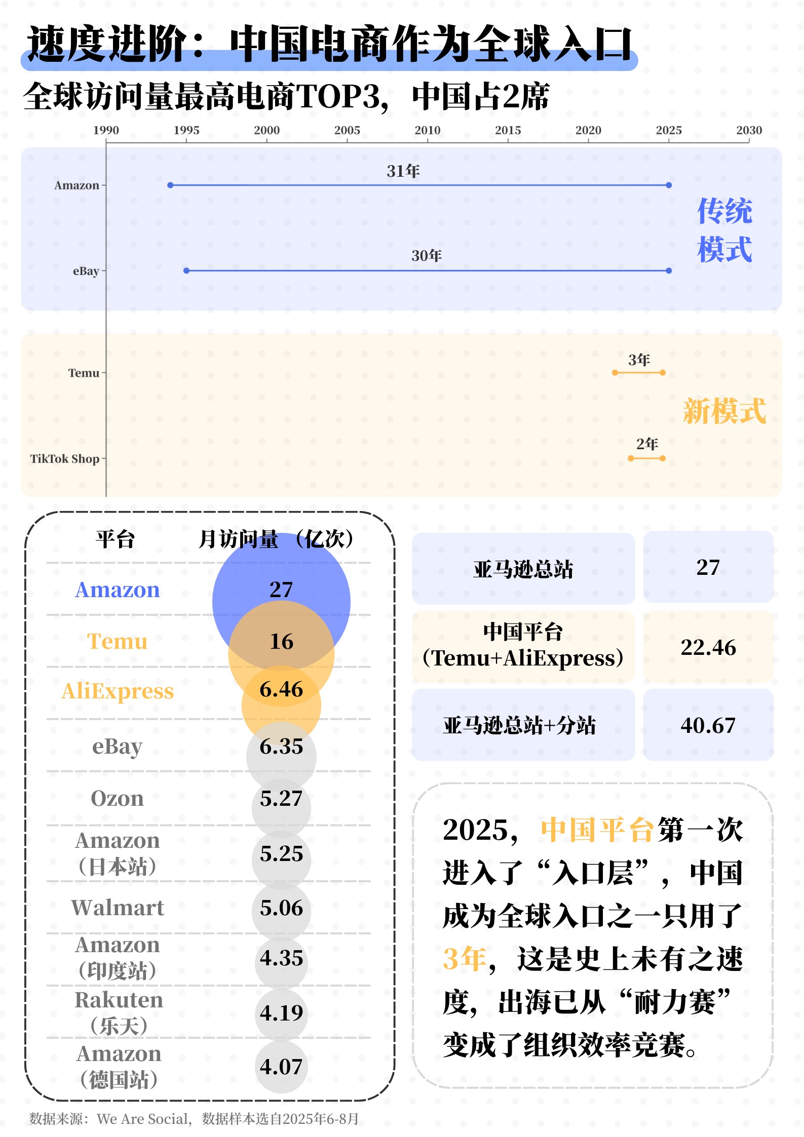 亞馬遜耗費(fèi)三十多年才完成全球化布局,而Temu、AliExpress等中國(guó)電商平臺(tái),僅用2到3年就躋身全球訪(fǎng)問(wèn)量前列。這種差異的根源不僅在于補(bǔ)貼策略,更體現(xiàn)在供應(yīng)鏈密度、組織運(yùn)行效率以及履約體系的整體壓縮能力上。
