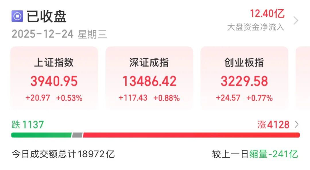 12月24日,A股三大指數(shù)全天呈現(xiàn)震蕩上行態(tài)勢,全市場超4000只個(gè)股飄紅。午后熱點(diǎn)題材板塊反復(fù)活躍,商業(yè)航天概念持續(xù)拉升,多只成分股漲停,電子產(chǎn)業(yè)鏈概念股也走強(qiáng)。