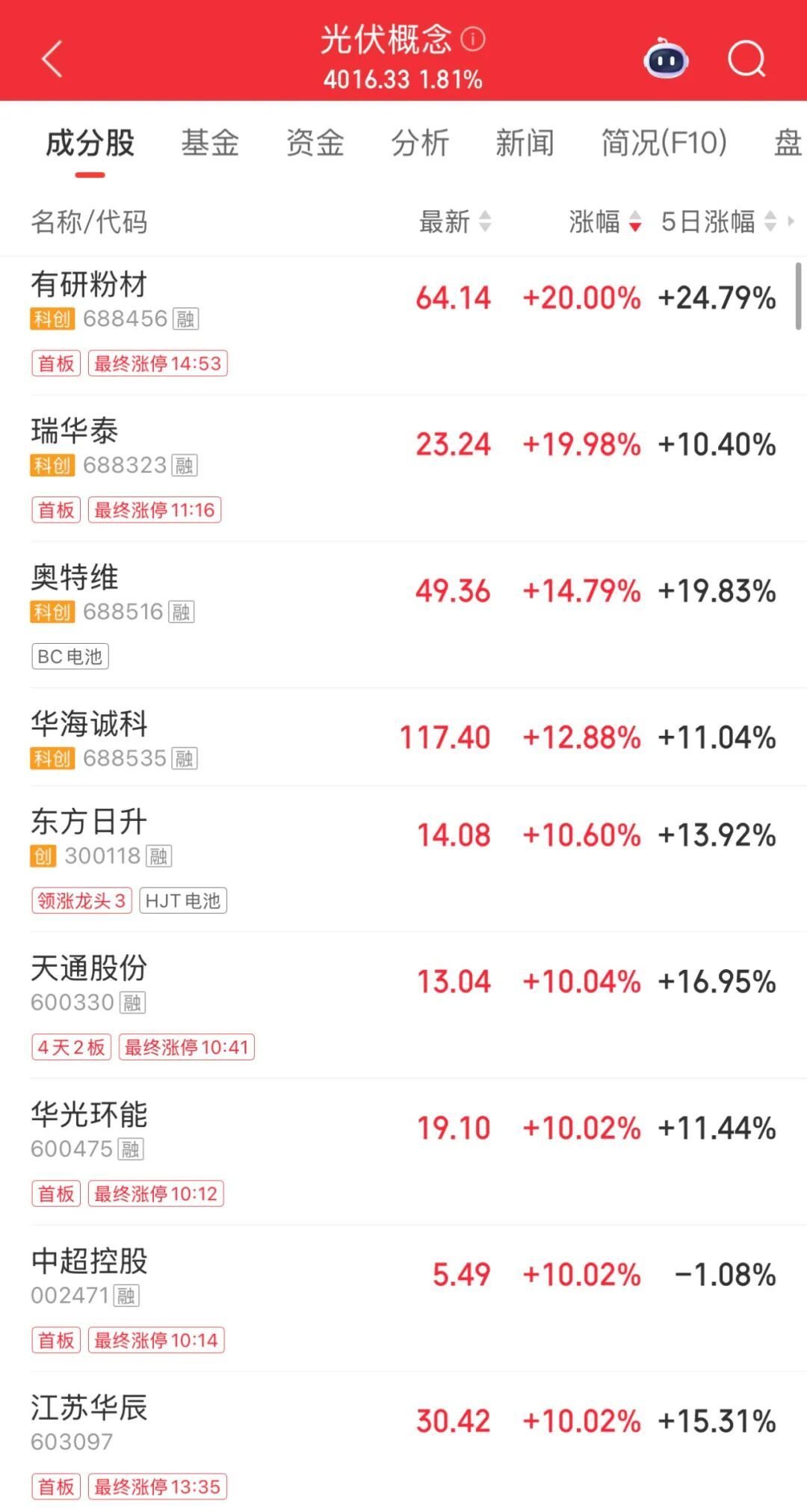 午后,光伏概念持續(xù)走強(qiáng),板塊內(nèi)多股漲停。有研粉材收獲“20CM”漲停,海南發(fā)展實(shí)現(xiàn)“4連板”,天通股份“4天2板”,中超控股、江蘇華辰等也紛紛漲停。