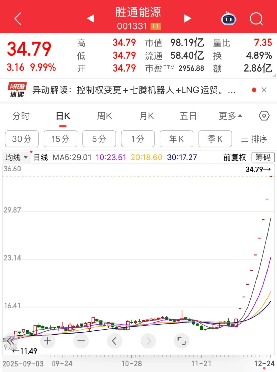 自12月12日起,勝通能源股價(jià)持續(xù)大漲。12月24日,該股再次漲停,實(shí)現(xiàn)連續(xù)9個(gè)“一字板”,股價(jià)創(chuàng)歷史新高,收?qǐng)?bào)34.79元/股,市值逼近百億元,收盤時(shí)封單超12萬手。今年以來,勝通能源股價(jià)累計(jì)漲幅達(dá)342.4%。
