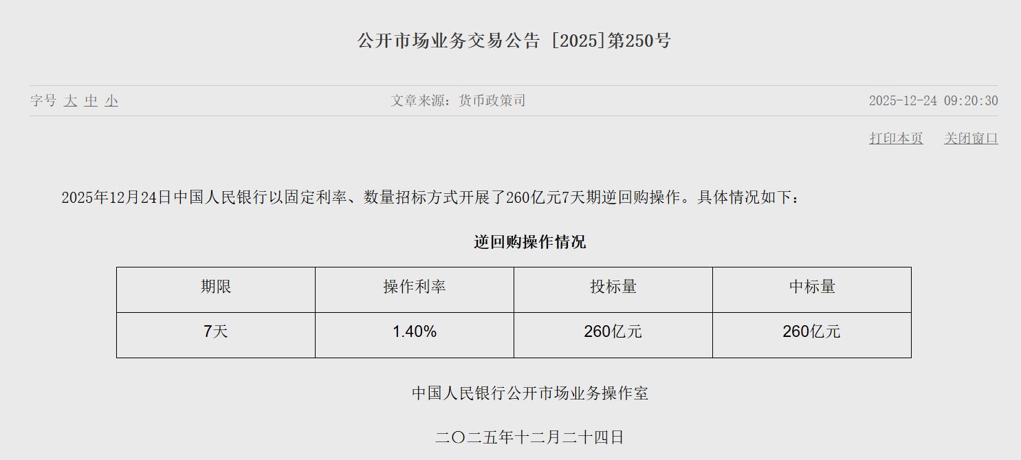 12月24日,中國(guó)人民銀行發(fā)布公告,為確保銀行體系流動(dòng)性保持充裕,2025年12月25日將通過(guò)固定數(shù)量、利率招標(biāo)、多重價(jià)位中標(biāo)相結(jié)合的方式,開(kāi)展規(guī)模達(dá)4000億元的中期借貸便利(MLF)操作,該操作期限為1年。