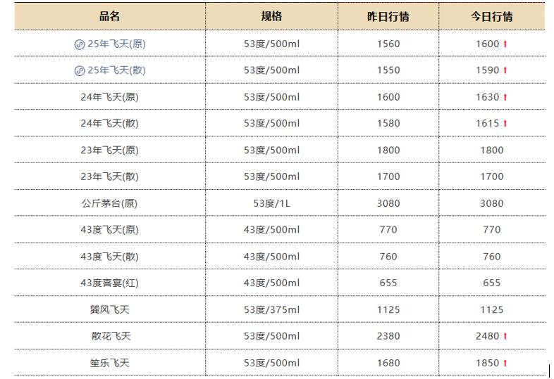 北京地區(qū)飛天茅臺報價維持在1980 - 2400元區(qū)間;廣州市場單價穩(wěn)定在1900 - 2400元區(qū)間。