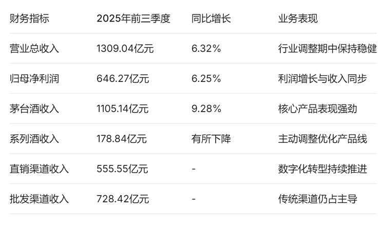 下表展示了茅臺2025年前三季度主要財務數(shù)據(jù)的表現(xiàn):