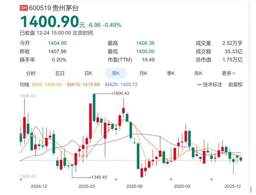 茅臺股價在12月24日收盤于1400.90元,略有下跌。
