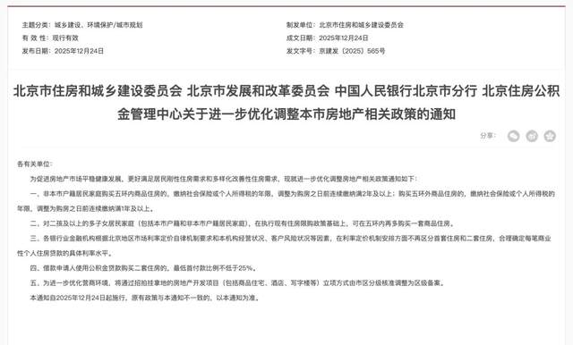 非京籍家庭五環(huán)內(nèi)購房社?;騻€(gè)稅年限從3年減至2年,京籍多子女家庭五環(huán)內(nèi)可購3套商品房……2025年12月24日起,北京購房者迎來新一輪政策利好。