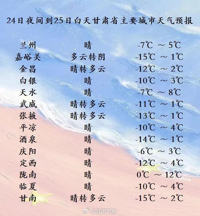 12月24日20時到12月25日20時,酒泉、嘉峪關(guān)兩市晴轉(zhuǎn)多云,山區(qū)部分區(qū)域有小雪;省內(nèi)其他地方晴或多云。