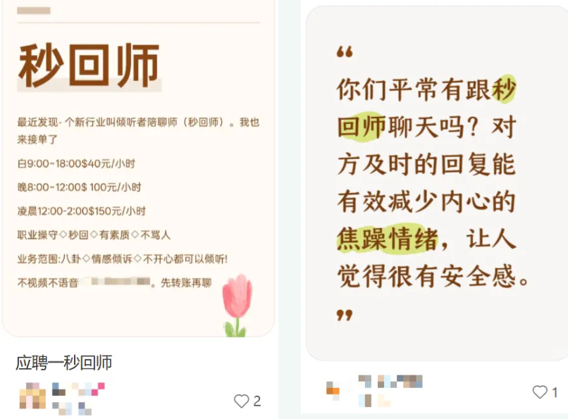 近年來,這個以即時回應(yīng)和情感陪伴為核心的新興職業(yè)逐漸受到關(guān)注。在社交平臺上搜索,能找到不少與“秒回師”相關(guān)的帖子。