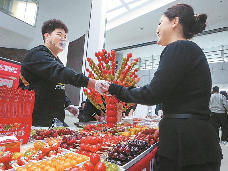顧客在龐記糖葫蘆攤位前試吃。記者 李鐸 見習(xí)記者 劉劍 攝