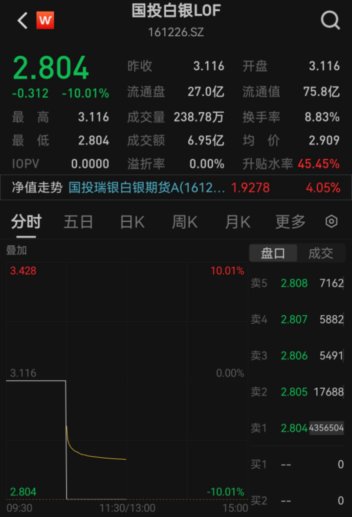 國投白銀LOF跌停情況