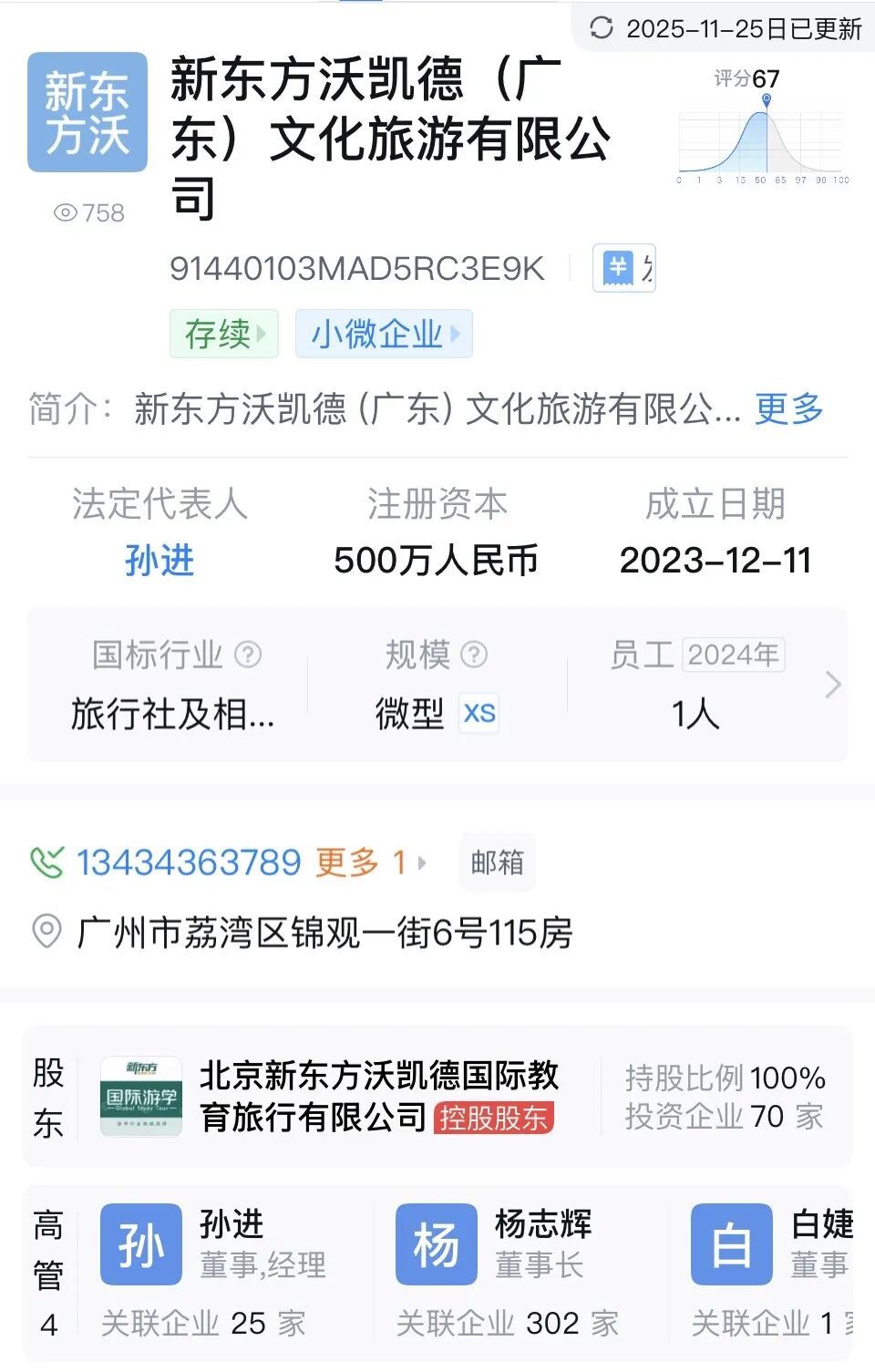 有意思報告整理公開資料發(fā)現(xiàn),今年年初孫進還以兼任華南新東方文旅總經(jīng)理的身份公開亮相,同時他也是“新東方文旅”旗下北京新東方沃凱德國際教育旅行有限公司全資子公司新東方沃凱德(廣東)文化旅游有限公司的法定代表人。
