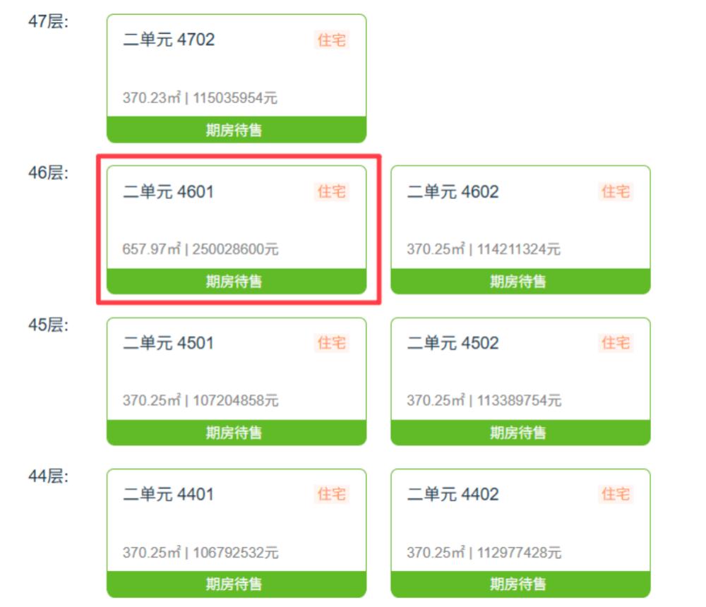 單價最高的是兩套頂層復(fù)式產(chǎn)品,519㎡戶型單價36萬元/㎡,總價約1.87億元;658㎡戶型單價38萬元/㎡,總價高達(dá)2.5億元。