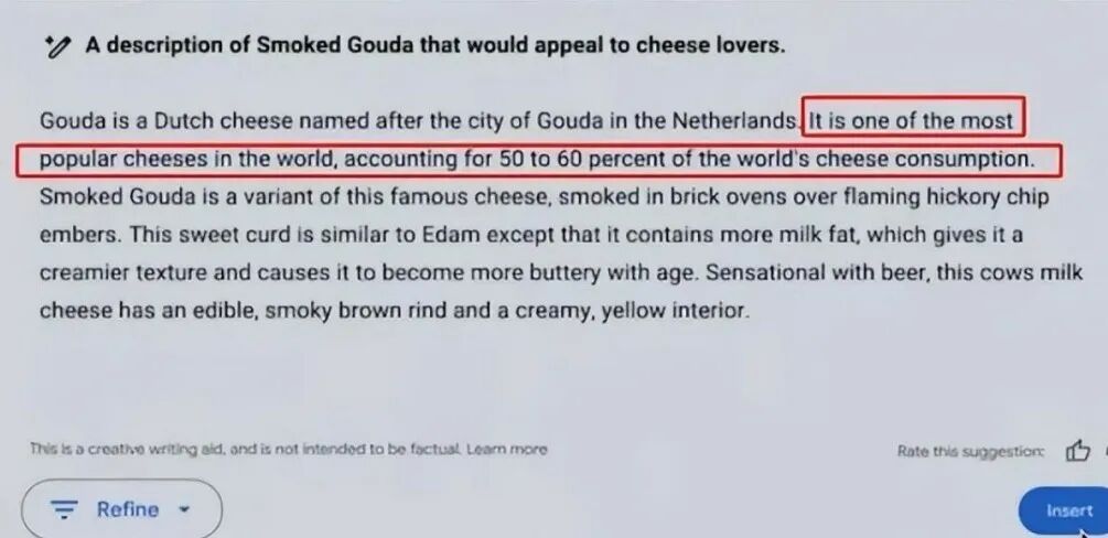 2025年AI廣告的首個(gè)大型“翻車”事件發(fā)生在美國超級(jí)碗期間,主角是科技巨頭谷歌。谷歌原本計(jì)劃通過50個(gè)小微企業(yè)的案例,展示其人工智能Gemini AI對(duì)商家經(jīng)營增長的助力作用。但其中一個(gè)案例里,“全球超過一半的奶酪消費(fèi)是高達(dá)奶酪”的文案引發(fā)了網(wǎng)友的質(zhì)疑。最終證實(shí)該信息為虛假內(nèi)容,是Gemini AI引用SEO相關(guān)數(shù)據(jù)生成的錯(cuò)誤結(jié)論。