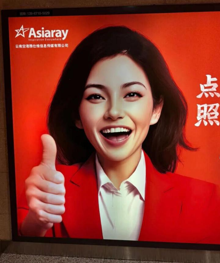 2025年3月,Asiaray在昆明機(jī)場投放的一則大屏廣告引發(fā)了公眾的強(qiáng)烈不適與批評(píng)。海報(bào)中的女孩五官比例失調(diào),咧嘴大笑時(shí),用于點(diǎn)贊的右手竟有6根手指,且其中5根相互粘連,網(wǎng)友紛紛表示“被這則AI廣告嚇到了”。