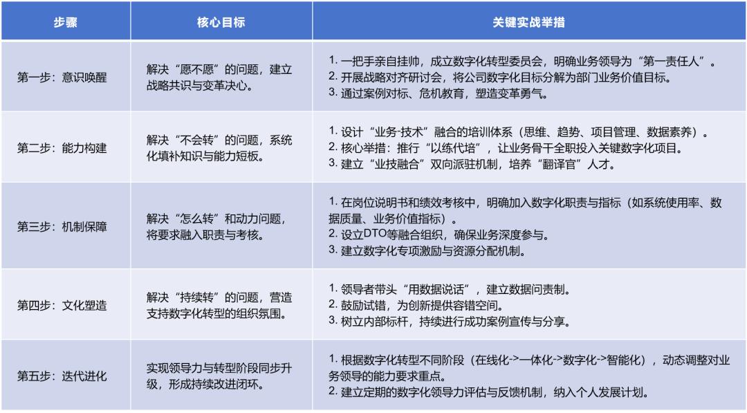 提升業(yè)務部門領導的數(shù)字化能力是一項系統(tǒng)性工程,需圍繞“意識轉變→能力構建→實踐賦能→機制固化→文化塑造”的主線推進。結合實戰(zhàn)經(jīng)驗,具體可參考以下路線: