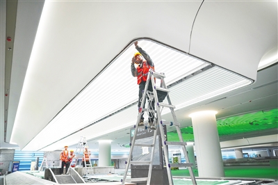 在三亞鳳凰國際機(jī)場三期項(xiàng)目T3航站樓的施工現(xiàn)場,工人們正有條不紊地進(jìn)行安檢設(shè)備組裝、室內(nèi)環(huán)境清潔以及屋面板安裝收尾等工作。