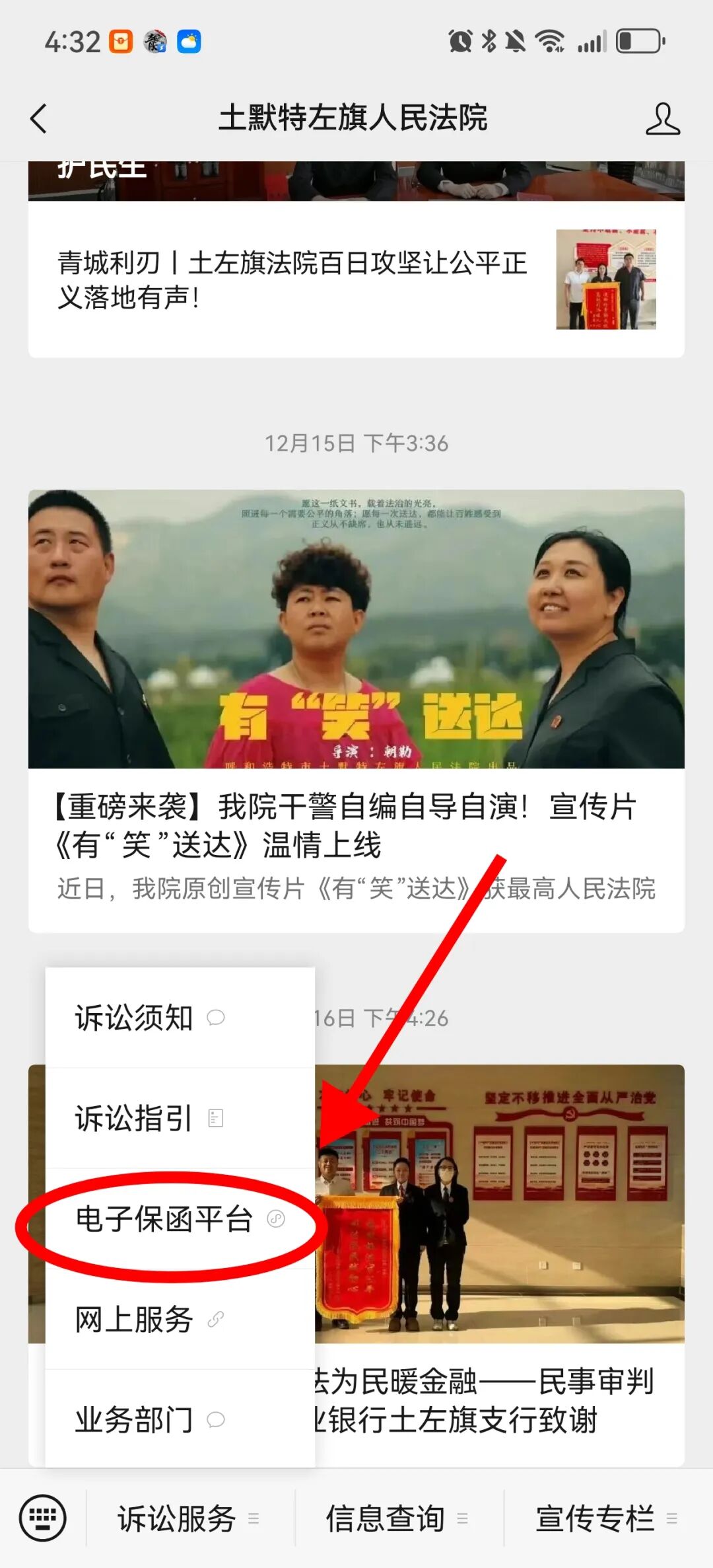 進(jìn)入“土默特左旗人民法院”微信公眾號(hào),點(diǎn)擊左下角“司法服務(wù)”,再選擇“電子保函平臺(tái)”即可跳轉(zhuǎn)進(jìn)入。