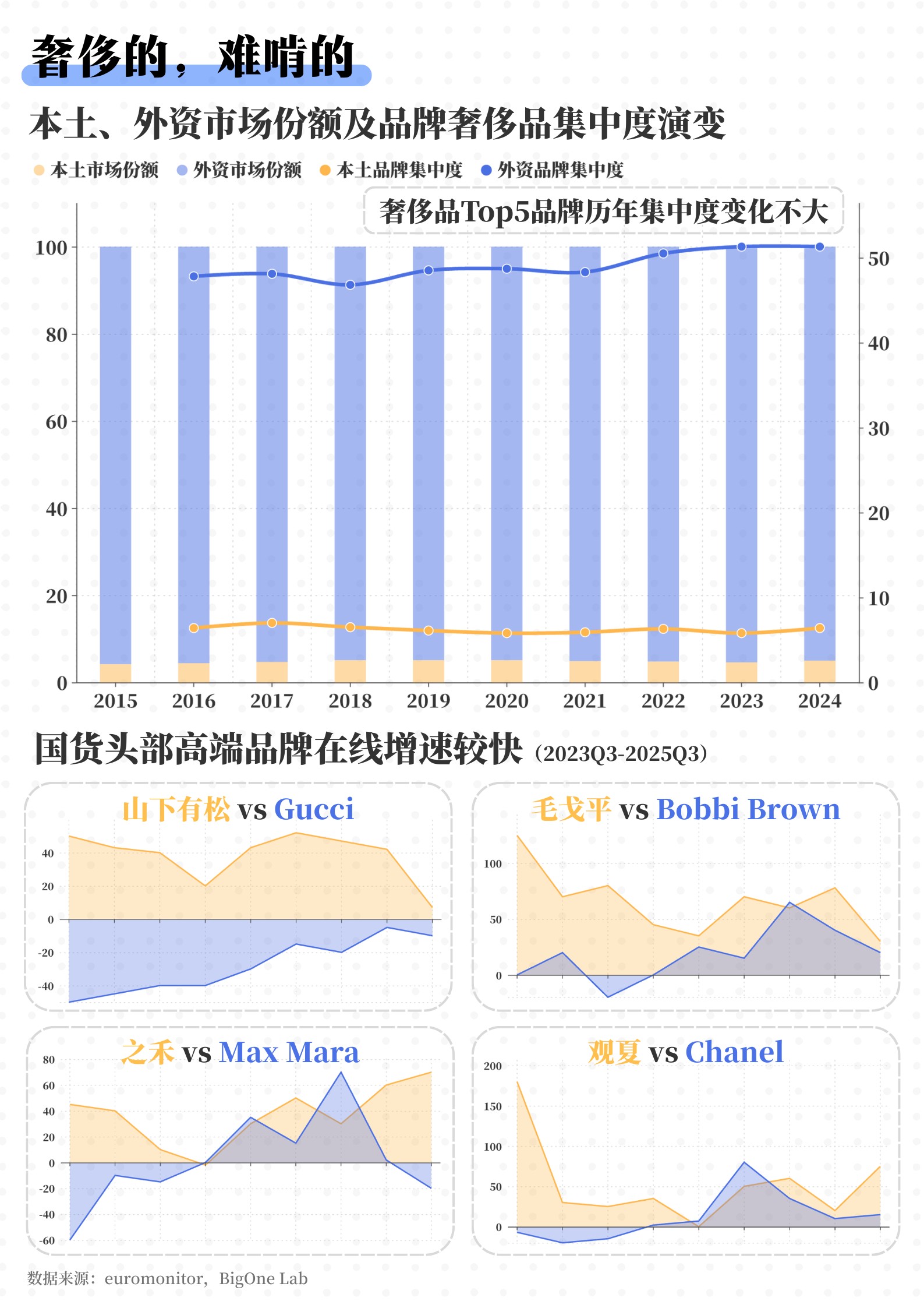 - 艱難的高端突破:在奢侈品這個(gè)“難攻克的領(lǐng)域”,外資前10大品牌(CR10)的占比高達(dá)60.90%,牢牢占據(jù)著95%的市場(chǎng)份額。雖然毛戈平、之禾、山下有松等頭部品牌正通過(guò)提高ASP(平均單價(jià))來(lái)嘗試高端化發(fā)展,但在改變消費(fèi)者“品牌認(rèn)知”的關(guān)鍵階段,國(guó)貨仍然處于被動(dòng)地位。