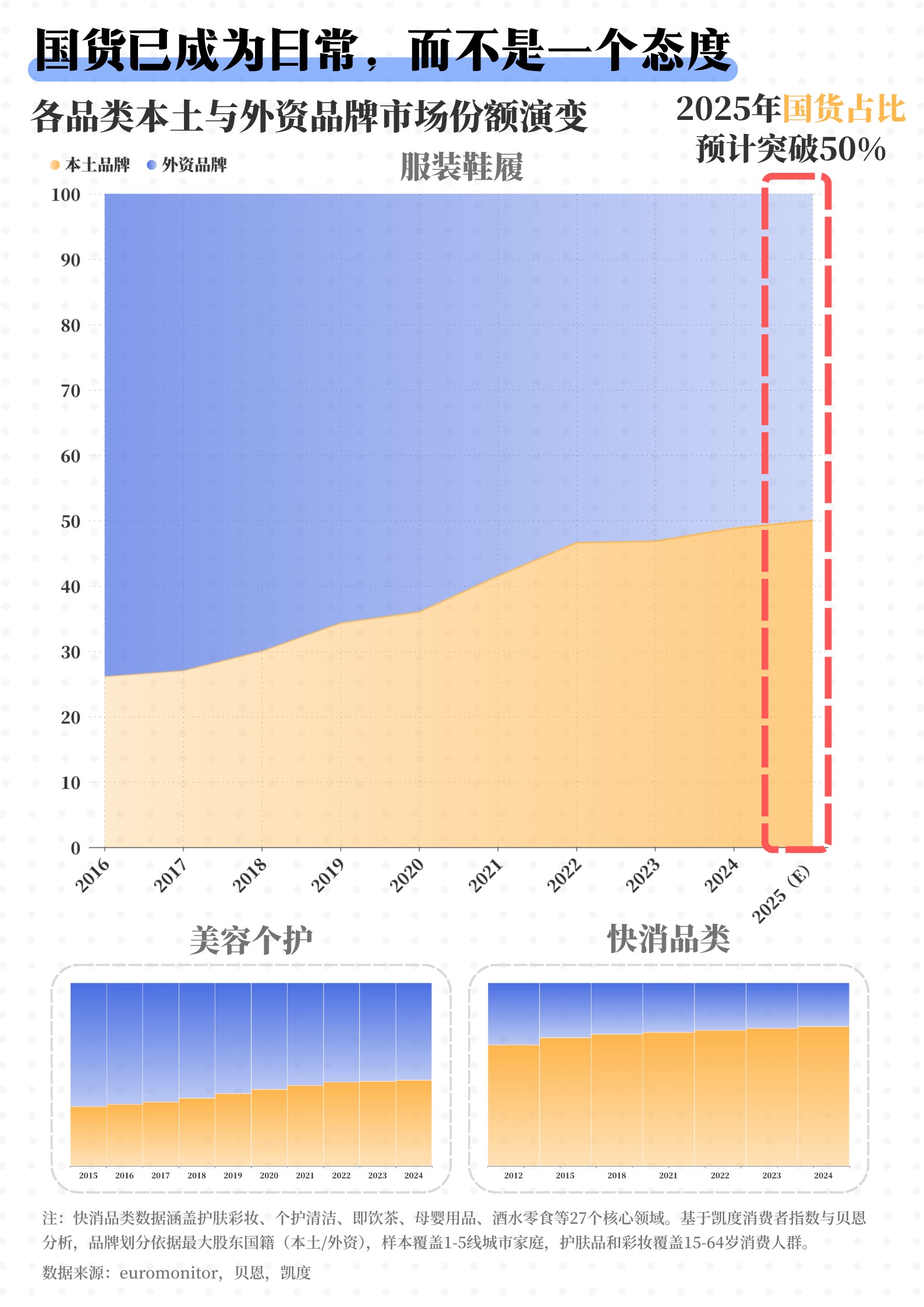 根據(jù)Euromonitor的數(shù)據(jù),2012年到2024年期間,在包含護(hù)膚、彩妝等27個(gè)快消品類(lèi)中,本土品牌的市場(chǎng)份額已從66%穩(wěn)定增長(zhǎng)到76%。特別是在服飾鞋履領(lǐng)域,2025年將迎來(lái)一個(gè)具有歷史意義的轉(zhuǎn)折點(diǎn):本土品牌預(yù)計(jì)會(huì)占據(jù)50%的市場(chǎng)份額,和外資品牌正式平分市場(chǎng)。
