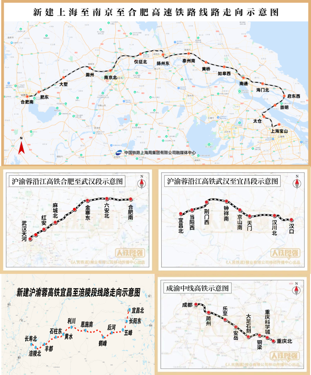 它由北沿江高鐵、合武高鐵、武宜高鐵、渝宜高鐵、成渝中線高鐵等路段組成。