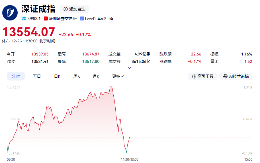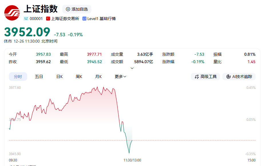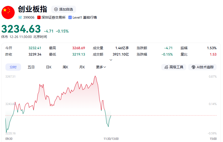 12月26日A股早盤呈現(xiàn)震蕩上行態(tài)勢,臨近午盤11:13左右,主要股指出現(xiàn)小幅跳水,上證指數(shù)、創(chuàng)業(yè)板指等由漲轉(zhuǎn)跌。