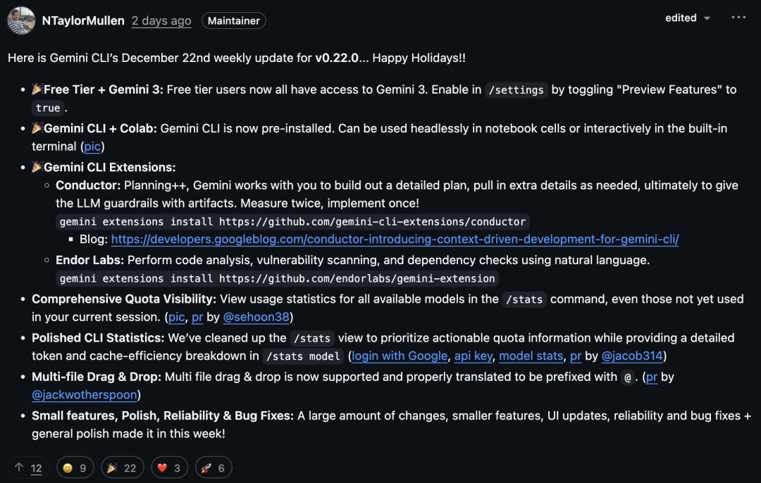 Gemini CLI在12月22日的周更新中明確標(biāo)注「Happy Holidays!!」,宣布免費(fèi)用戶也可使用Gemini 3,并在Google One年費(fèi)套餐中,將Gemini 3 Pro及一系列AI工具打包為「半價年貨」。
