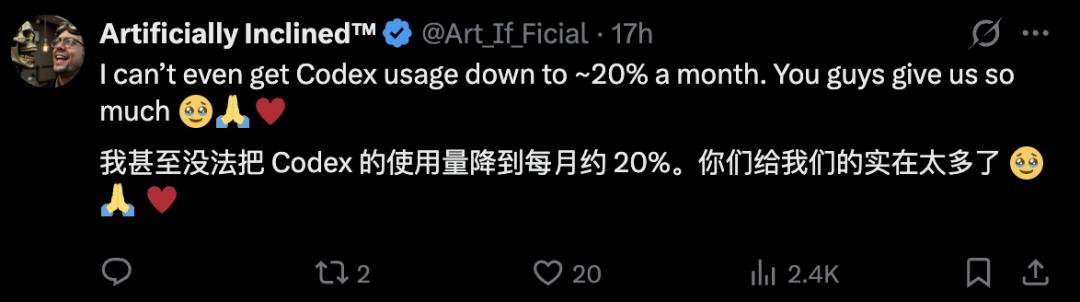 除了推出圣誕限定版Codex,OpenAI的節(jié)日福利還包含重置速率限制,并將使用上限提升至平日的2倍,該福利將持續(xù)至明年1月1日。