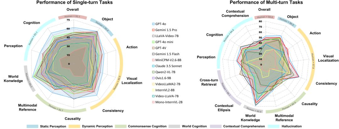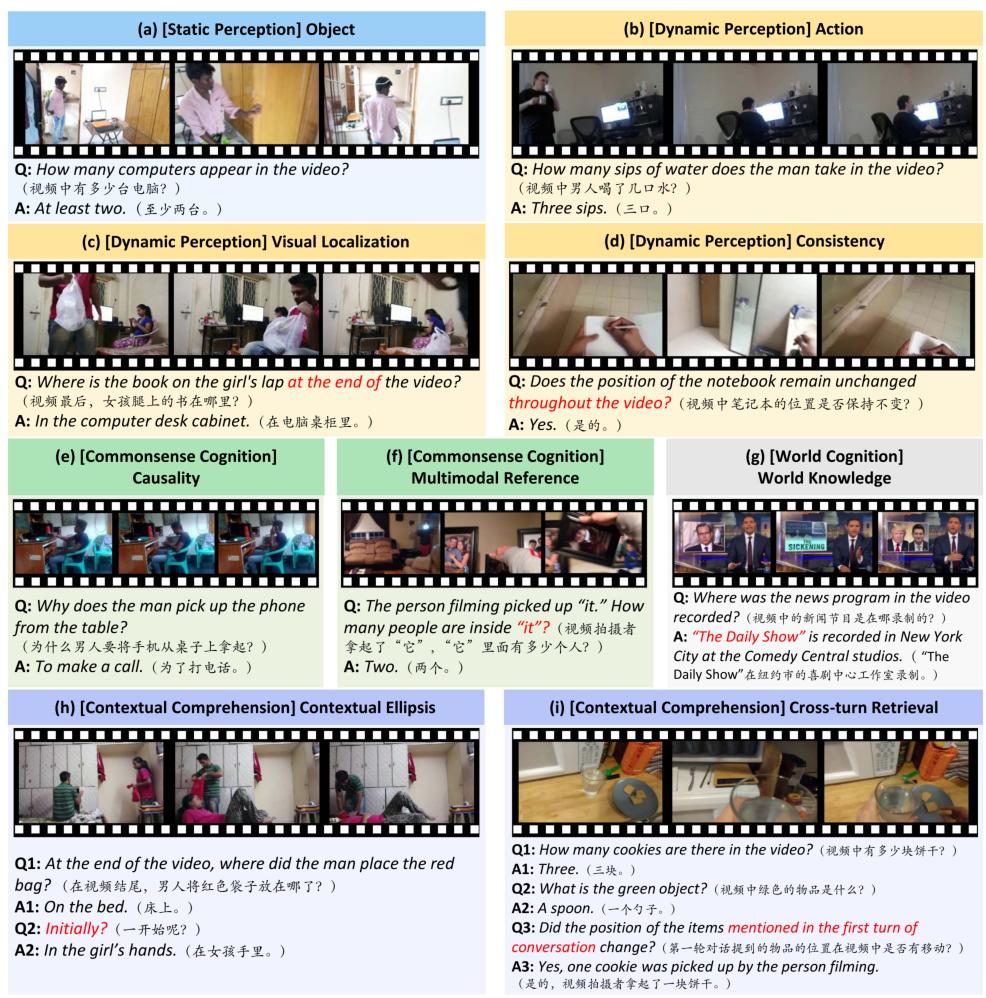 更關(guān)鍵的是,它引入多輪對話評測(最多5輪),要求模型具備連貫的上下文理解、信息關(guān)聯(lián)與指代消解能力,這是此前視頻評測中常缺失的部分。
