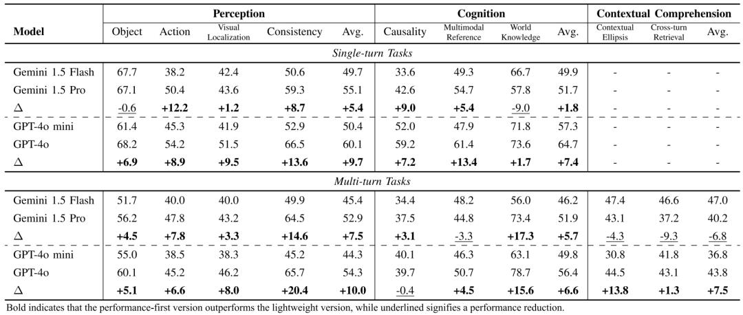 輕量版與性能版模型的平衡對比GPT-4o/GPT-4o mini和Gemini 1.5 Pro/Gemini 1.5 Flash發(fā)現(xiàn),性能更強(qiáng)的版本在絕大多數(shù)任務(wù)上領(lǐng)先。