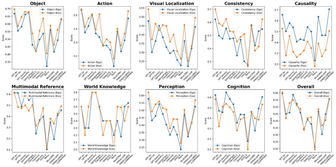 視角偏好:幾乎所有模型在第三人稱(外視角)視頻上的表現(xiàn)都系統(tǒng)性優(yōu)于第一人稱(自我視角)視頻。研究者分析,這可能是因?yàn)榈谝蝗朔Q視頻有更多運(yùn)動模糊、視角突變和遮擋,對模型動態(tài)感知要求更高。