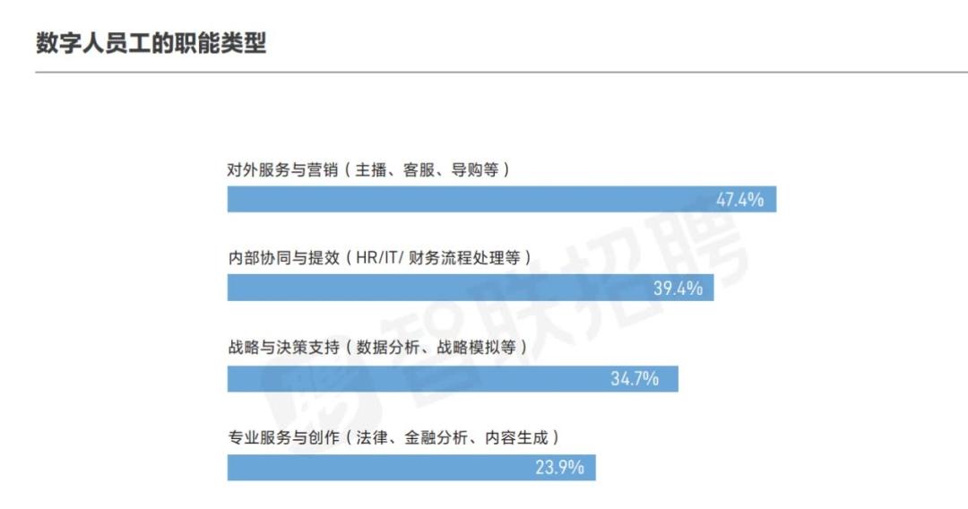 當(dāng)前,整個(gè)職場(chǎng)確實(shí)在經(jīng)歷AI替代帶來(lái)的“陣痛”。智聯(lián)招聘最新發(fā)布的《2025雇傭關(guān)系趨勢(shì)報(bào)告》顯示,10.3%的職場(chǎng)人所在企業(yè)已正式引入“數(shù)字員工”,其中47.4%用于直播導(dǎo)購(gòu)、智能客服、虛擬助手等面向客戶的高頻交互場(chǎng)景;39.4%承擔(dān)HR、財(cái)務(wù)、法務(wù)等中后臺(tái)流程自動(dòng)化工作;超三成甚至能涉足數(shù)據(jù)分析與戰(zhàn)略模擬等高端領(lǐng)域。