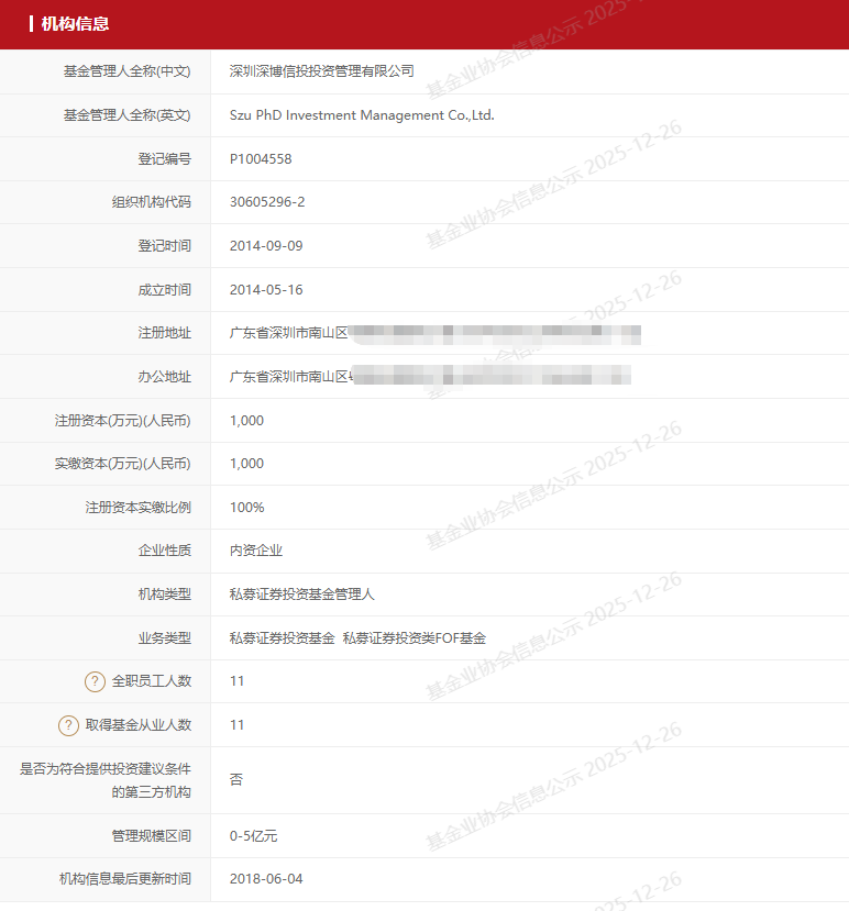 公開信息顯示,深博信投2014年成立,注冊資本1000萬元,全職員工11人,管理規(guī)模0~5億元。