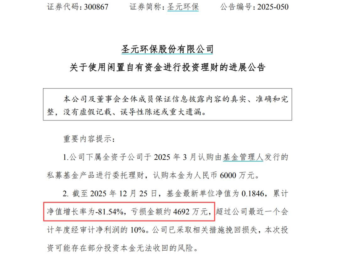 【導(dǎo)讀】圣元環(huán)保子公司購私募虧4600余萬,已向警方報案