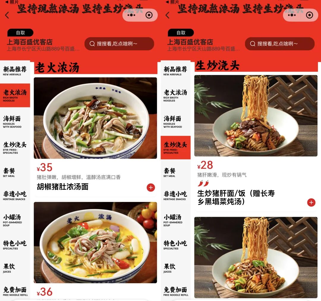 一年前,和府撈面子品牌和府湯面登場(chǎng),核心賣點(diǎn)是“牛排配面”,推出多款鐵板牛排產(chǎn)品。然而一年后,該品牌已告別原有模式,轉(zhuǎn)向生炒澆頭面與現(xiàn)熬濃湯面系列,新品有胡椒豬肚濃湯面、酸辣豬肚濃湯面、生炒豬肝面、生炒腰花面等,還上線三款非遺小吃,人均約35元。