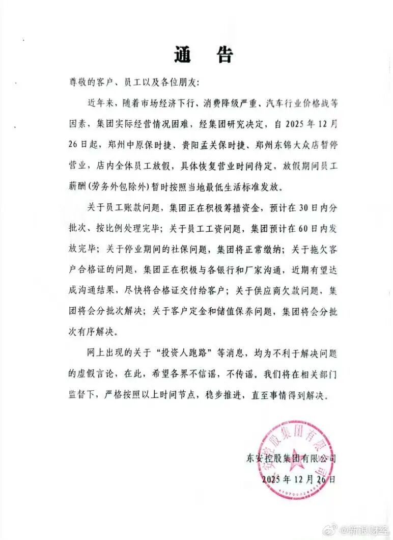 12月26日,針對(duì)鄭州中原保時(shí)捷中心疑閉店“跑路”一事,東安控股集團(tuán)回應(yīng)稱:“近年來集團(tuán)實(shí)際經(jīng)營困難,經(jīng)研究決定,自2025年12月26日起,鄭州中原保時(shí)捷、貴陽孟關(guān)保時(shí)捷、鄭州東錦大眾店暫停營業(yè),全體員工放假,恢復(fù)營業(yè)時(shí)間待定。放假期間,員工薪酬(勞務(wù)外包除外)暫按當(dāng)?shù)刈畹蜕顦?biāo)準(zhǔn)發(fā)放。”