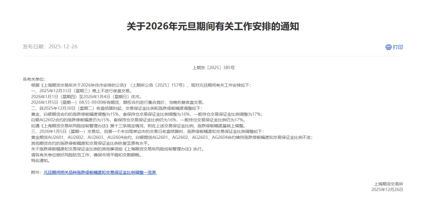 此外,2026年1月5日(星期一)交易結(jié)束后,從第一個未出現(xiàn)單邊市的交易日收盤結(jié)算時起,黃金期貨AU2601、AU2602、AU2603、AU2604合約,白銀期貨AG2601、AG2602、AG2603、AG2604合約的漲跌停板幅度和交易保證金比例保持不變;其他期貨合約的漲跌停板幅度和交易保證金比例恢復(fù)至原有水平。