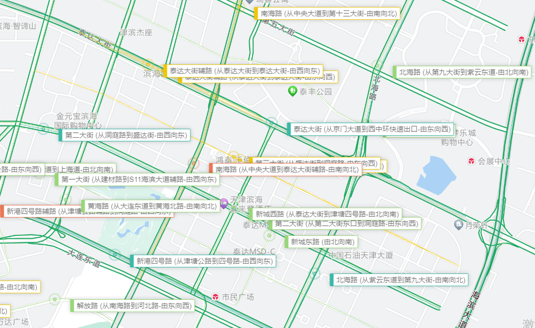 工作日早高峰7-9時(shí),晚高峰17-19時(shí),紅色區(qū)域?yàn)檐?chē)多緩行區(qū)域,黃色區(qū)域?yàn)榱髁吭黾訁^(qū)域: