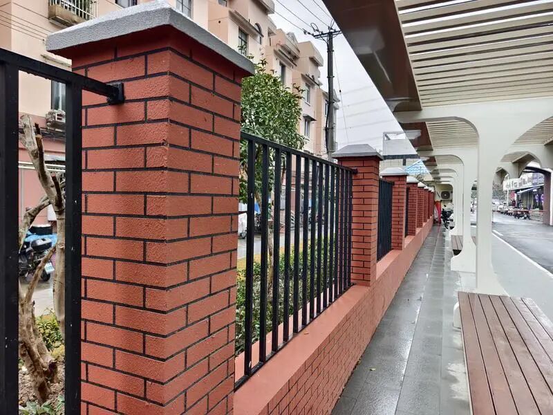 原來,風(fēng)雨連廊南側(cè)就是海濱八村。為了配合“五八通道”拓寬和連廊建設(shè),海濱八村北側(cè)圍墻向南遷移重建。新建圍墻不僅要求通透見綠,還在造型、色彩上做了全面提升。之前的黑底白邊只是施工過程中的臨時(shí)狀態(tài),最終呈現(xiàn)的是暖色調(diào)效果:紅褐色墻體搭配黑色鐵藝,“紅黑配”的設(shè)計(jì)讓“五八通道”與海濱八村更顯美觀。