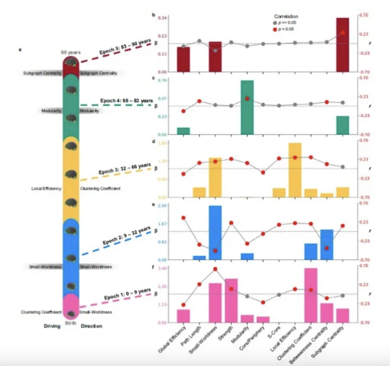 《自然通訊》2025年刊載的一項(xiàng)群體層面分析《人類生命周期的拓?fù)滢D(zhuǎn)折點(diǎn)》(Mousley等)引發(fā)了廣泛關(guān)注。該研究通過分析4216名0至90歲受試者的擴(kuò)散磁共振成像,繪制出大腦結(jié)構(gòu)網(wǎng)絡(luò)的演變圖譜,揭示了四個(gè)關(guān)鍵轉(zhuǎn)折點(diǎn)和五個(gè)發(fā)展階段。