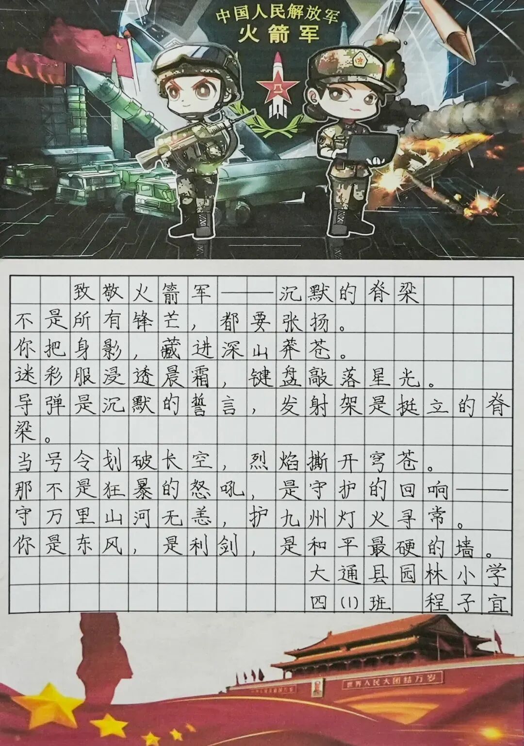 真情最是暖人心!此次祝福征集活動(dòng)組織扎實(shí)、形式豐富,獲獎(jiǎng)師生收到了精美的火箭軍文創(chuàng)產(chǎn)品。這不僅加深了師生們愛黨愛國愛軍的情懷,更在孩子們心中播下了“國防有我”的種子。