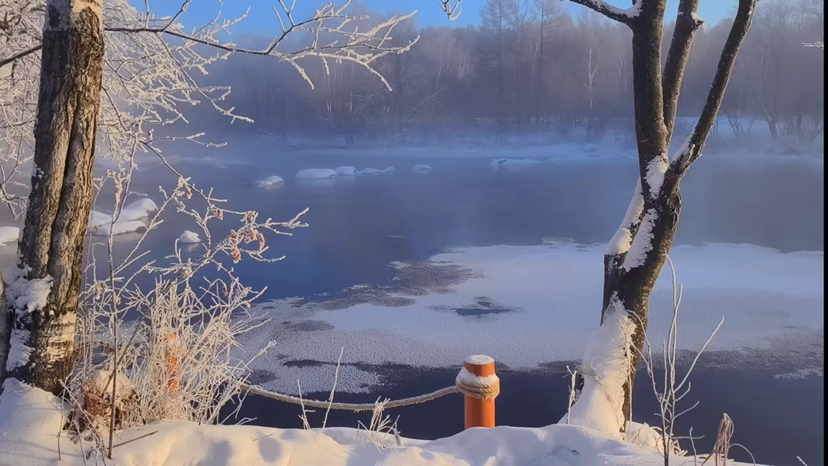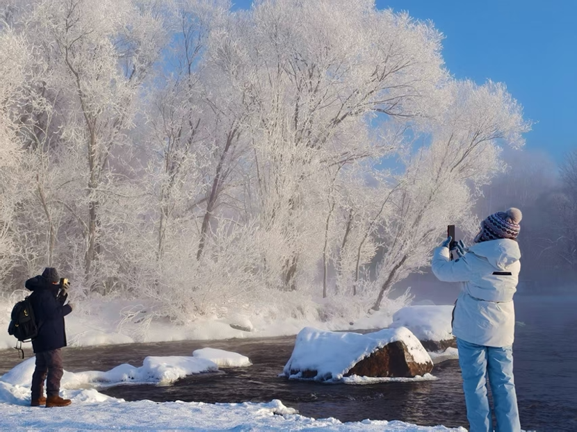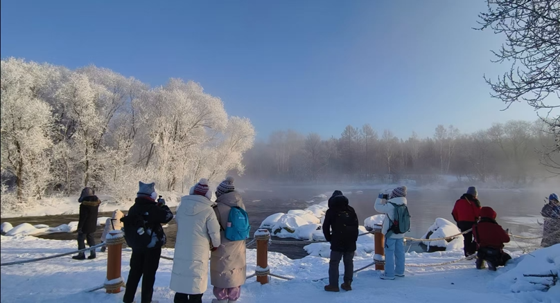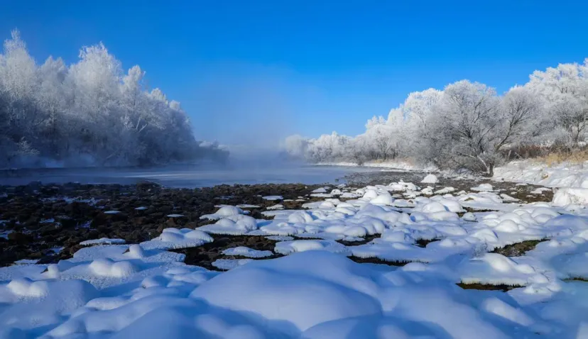 河面霧氣裊裊升騰,沿河兩岸的樹木凝結(jié)成連綿的玉樹瓊枝,湊近細看枝椏,冰晶層層疊疊,精致動人。漫步在這樣的景致中,仿佛踏入了一幅徐徐展開的水墨長卷。