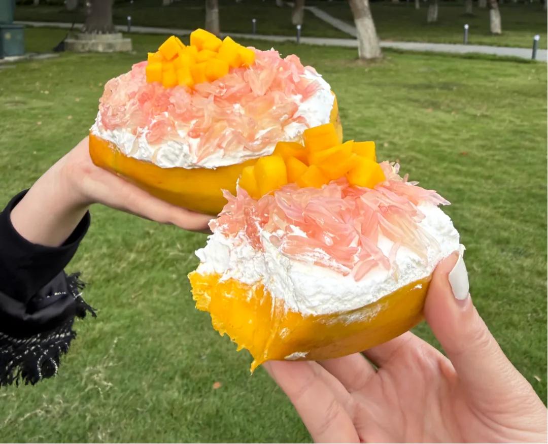 這款產(chǎn)品最初是網(wǎng)友將半個新鮮芒果涂抹上干噎酸奶,再撒上西柚粒、爆爆珠等制作而成,因簡單好吃引發(fā)了大量網(wǎng)友跟風(fēng)復(fù)制。