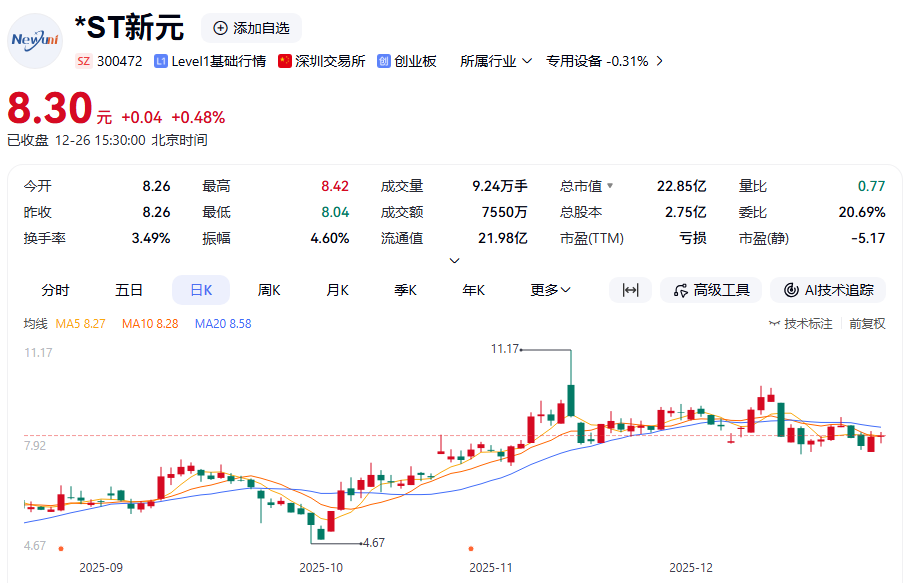 從行情來看,*ST新元最新的股價(jià)為8.3元/股,總市值達(dá)到22.85億元。