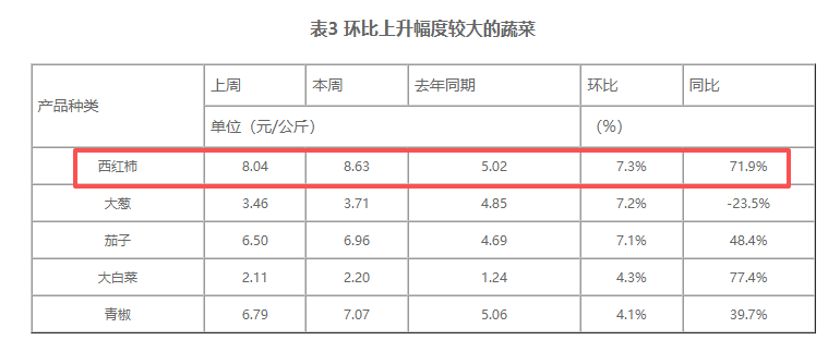 農(nóng)業(yè)農(nóng)村部信息中心發(fā)布的《全國農(nóng)產(chǎn)品批發(fā)市場一周價格行情監(jiān)測報告(2025年12月12日—2025年12月18日)》顯示,在重點監(jiān)測的19種蔬菜中,西紅柿、大蔥、茄子、大白菜和青椒的價格環(huán)比漲幅較大,分別為7.3%、7.2%、7.1%、4.3%和4.1%。其中,西紅柿價格同比增長71.9%。