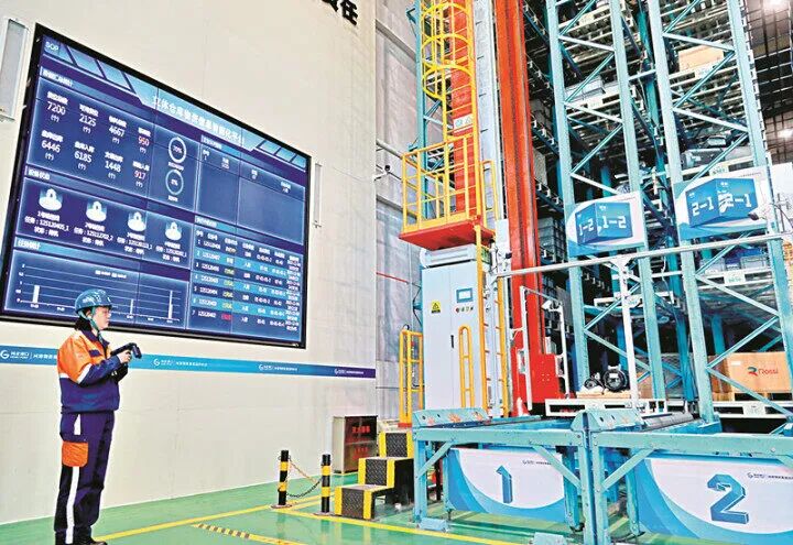 在中控室明亮的電子屏前,4名身著工裝的女庫管員指尖輕點,監(jiān)控著自動穿梭的堆垛機。