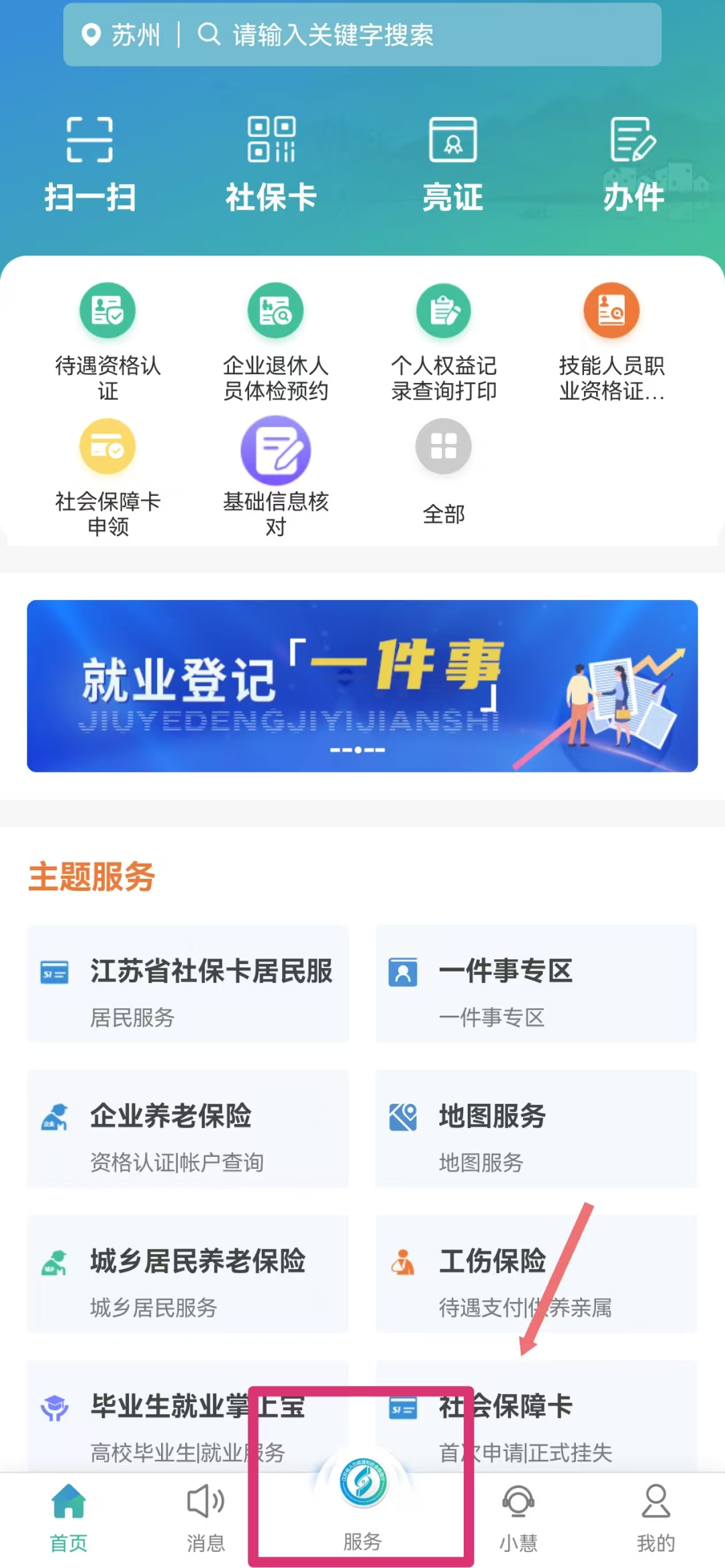 第一步:登錄“江蘇智慧人社”APP或小程序,選擇參保地蘇州,點擊“服務(wù)”選項。