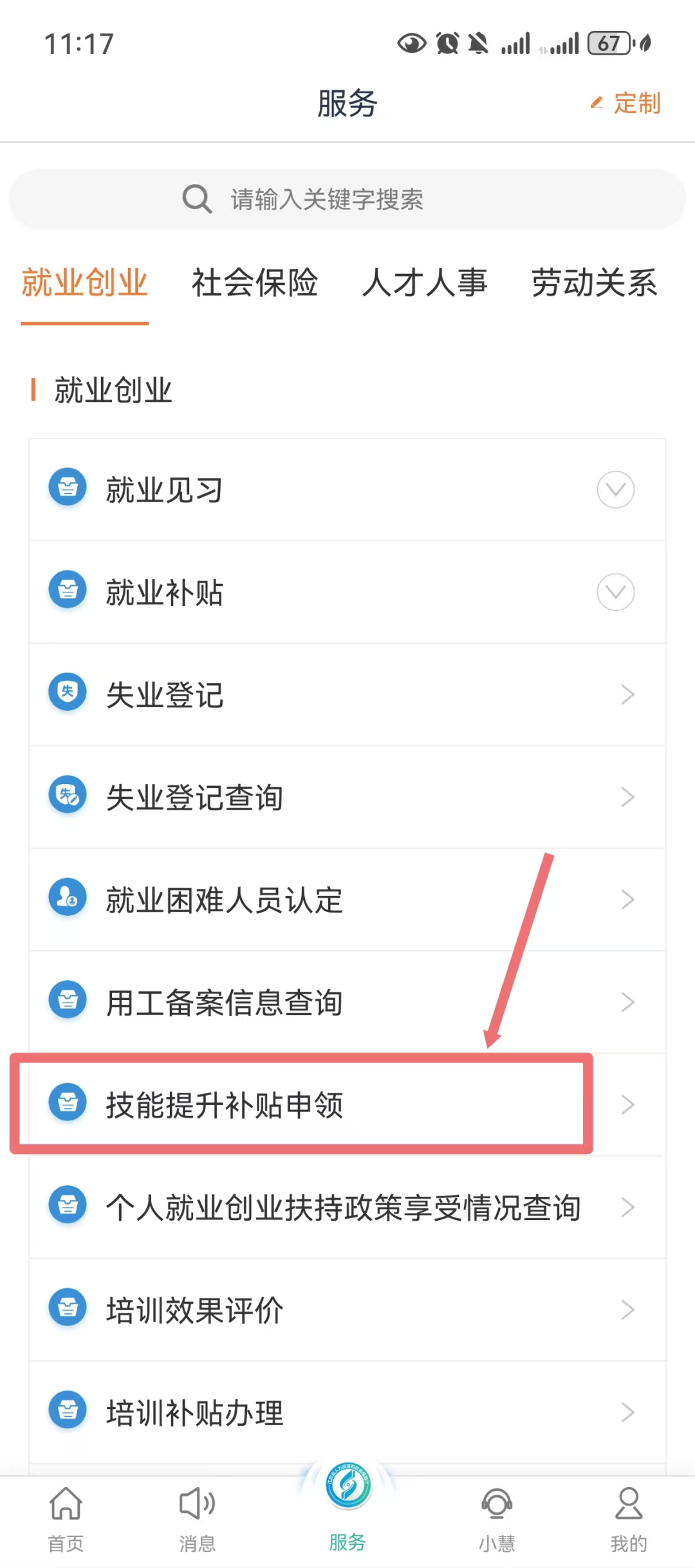 第二步:選擇“就業(yè)創(chuàng)業(yè)-技能提升補貼申領(lǐng)”。