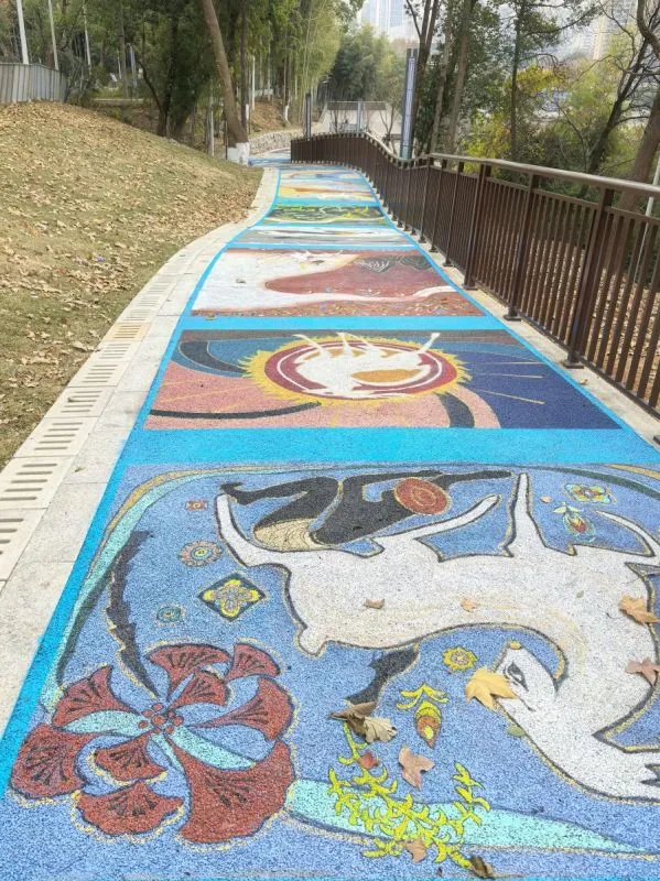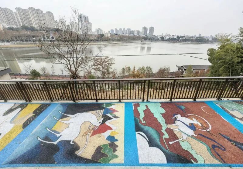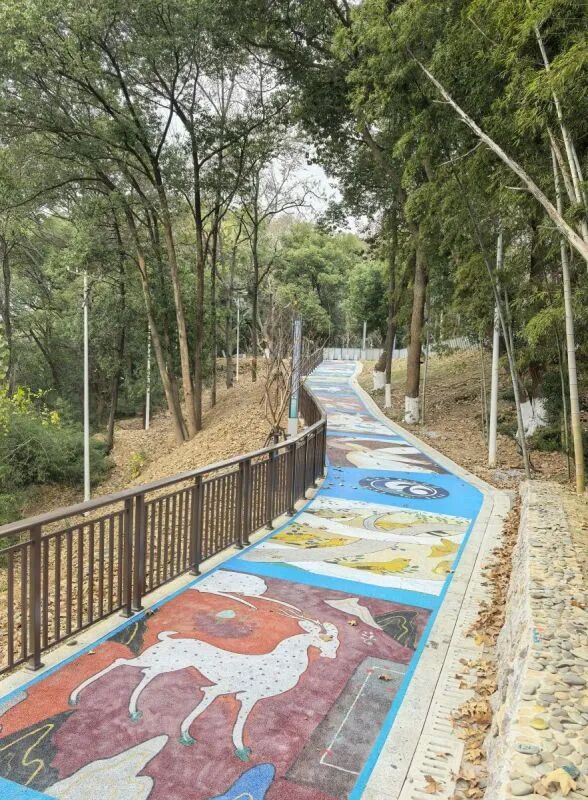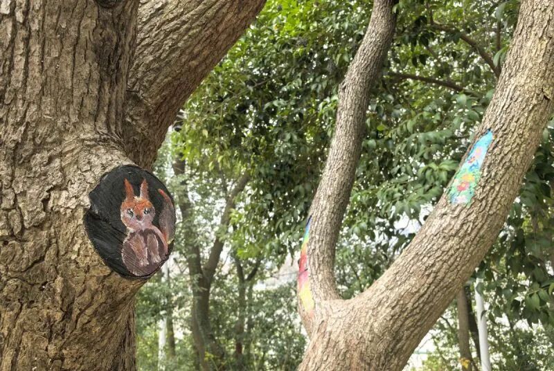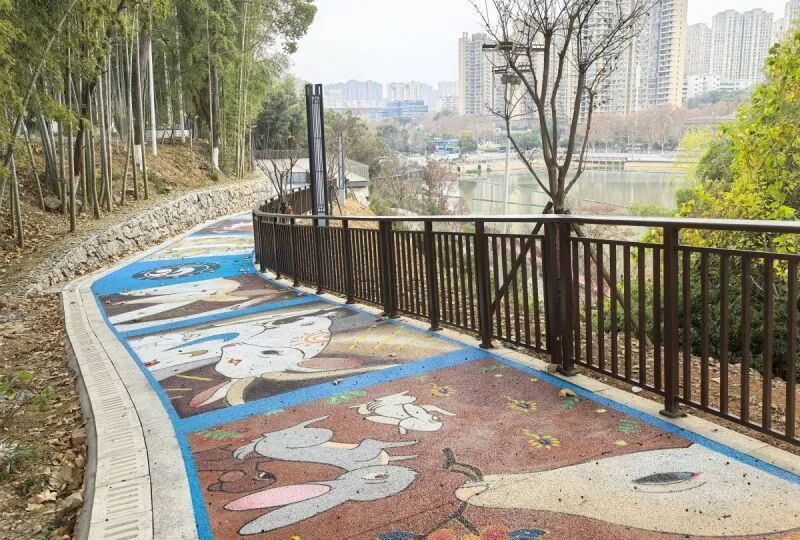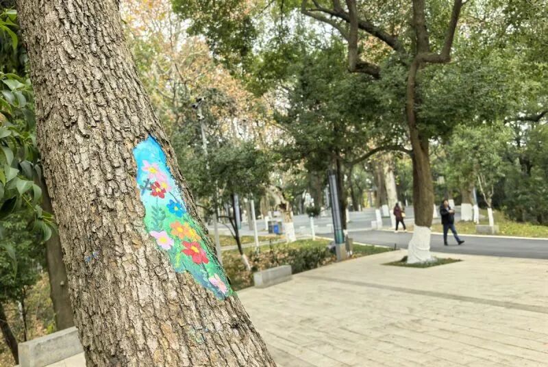近日,九江南湖公園連接凌煙棧道的那條小徑悄悄換上了新模樣。原本普通的地面上,多了好些色彩鮮亮的動(dòng)物彩繪;就連樹木脫皮的地方、斷枝的切口,也被巧妙地畫上了松鼠、花草之類的圖案,給冬日里的公園添了不少靈動(dòng)的趣味。
