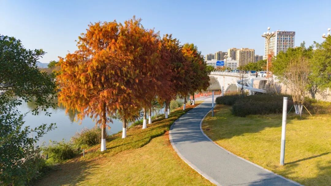 蒼南縣城新區(qū)中心湖公園也有零星分布的落羽杉,為冬日增添了一抹暖色。沿著湖畔小道漫步,一側(cè)是波光粼粼的湖水,另一側(cè)是如詩(shī)如畫的紅杉林,水天一色,樹影搖曳,宛如置身畫中。