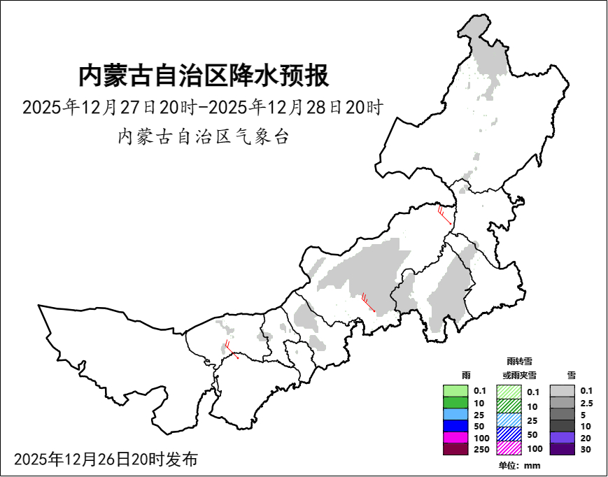 具體來看,12月27日20時(shí)至12月28日20時(shí),巴彥淖爾市中部、東部偏東區(qū)域,包頭市北部,呼和浩特市北部,烏蘭察布市北部,錫林郭勒盟中部,赤峰市大部分地區(qū),通遼市西北部,興安盟西北部,呼倫貝爾市北部及中部部分地區(qū)天氣以多云為主,伴有分散性小雪;西部偏北、偏東以及中東部大部分地區(qū)會(huì)刮起4到5級(jí)的西北風(fēng),短時(shí)風(fēng)力可達(dá)6到7級(jí),局部地區(qū)甚至能達(dá)到8級(jí);中部偏北和東北部偏西地區(qū)的氣溫將下降4至6攝氏度,部分區(qū)域降溫幅度可達(dá)6到8攝氏度。